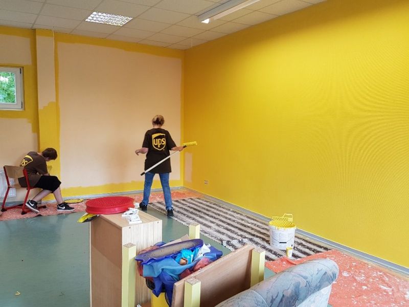 Die Katholische Grundschule Lülsdorf durfte sich nach einer Nachbarschaftsaktion von UPS im Juni 2018 über drei frisch gestrichene Klassenräume für die Erstklässler des kommenden Schuljahres und für einen OGS-Gruppenraum freuen. Andrea Batschauer, deren Kind die Grundschule besucht, organisierte die Community Involvement Aktion im Vorfeld und betreute sie am Einsatztag vor Ort. Rund 50 Stunden waren neun ehrenamtliche Helfer von UPS mit dem Streichen der Räumlichkeiten beschäftigt.